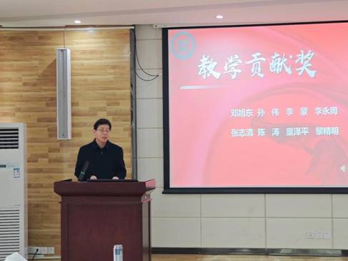 伍学云宣读《关于表彰2023年度教学贡献奖、科研贡献奖和管理服务贡献奖的决定》。