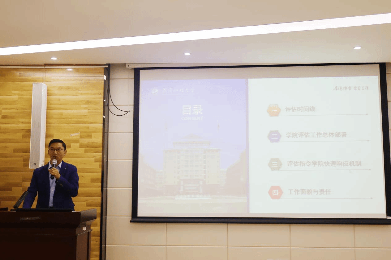 会上,副院长黎精明发表动员讲话,围绕评估时间线、学院评估工作总体部署、评估指令学院快速响应机制、工作面貌与责任四个维度做出全面安排和部署。他对前期迎评准备工作进行了系统总结,对评估的时间安排做了详细说明,对评估期间的各项任务做了细致分工和缜密部署,并提出了具体工作要求。对于涉及广大教师的课堂教学秩序维护与质量提升、教学材料规范化整理、指令快速响应方式等关键问题做了重点安排和部署。