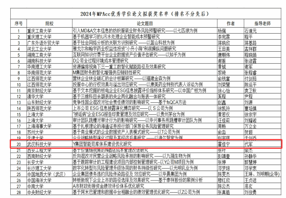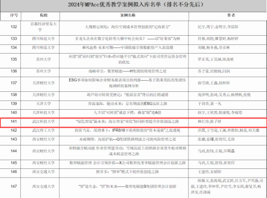 pa电子官网代军教授指导的MPAcc研究生霍佳宁撰写的学位论文《Y集团智能司库体系建设优化研究》,从众多作品中脱颖而出,荣获2024年全国MPAcc优秀学位论文奖(全国仅28篇入选);林红珍副教授团队开发的案例《“绿色智造”赢未来:海尔智家“双化”协同转型提升价值创造之路》成功入选2024年全国MPAcc优秀教学案例库(全国仅201篇入选)。