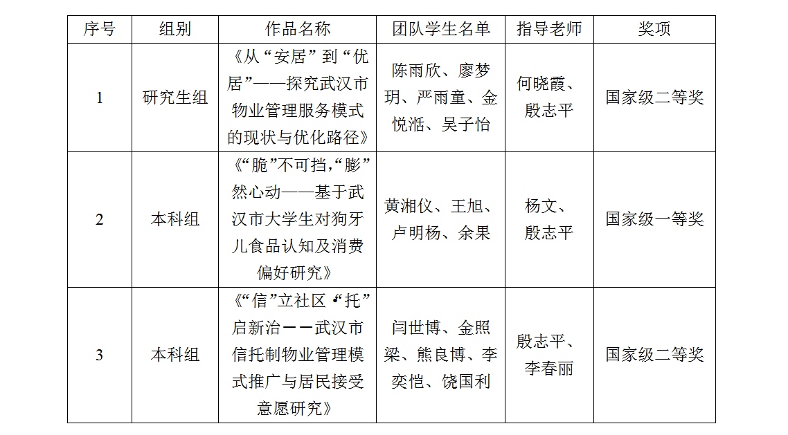 在研究生组决赛中,pa电子官网何晓霞、殷志平老师指导,陈雨欣等同学的作品《从“安居”到“优居”——探究武汉市物业管理服务模式的现状与优化路径》荣获研究生组国家级二等奖。