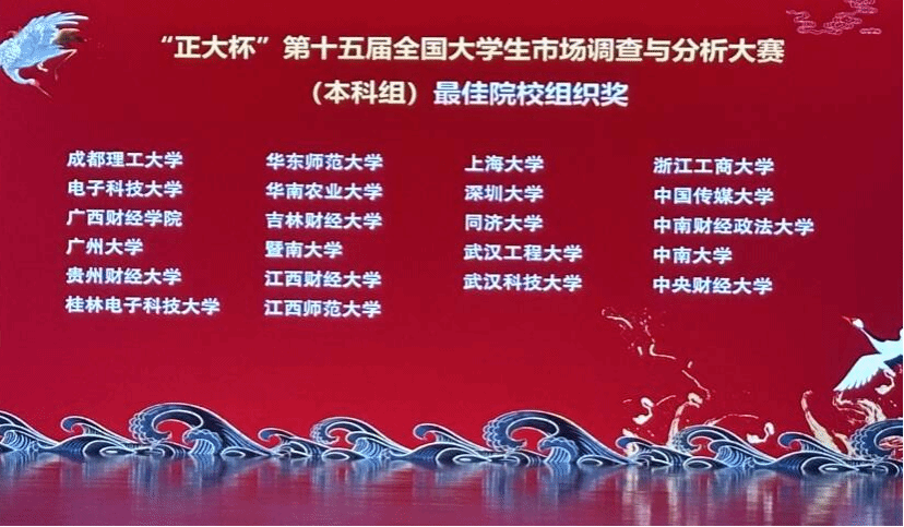 近日,由中国商业统计学会主办的“正大杯”第十五届全国大学生市场调查与分析大赛研究生组总决赛、本科组总决赛分别在贵州大学、浙江财经大学落下帷幕。pa电子官网在此次大赛中取得佳绩,研究生参赛团队荣获国家级二等奖1项,本科生参赛团队荣获国家级一等奖1项、二等奖1项。此外,本校获得此次比赛最佳院校组织奖。