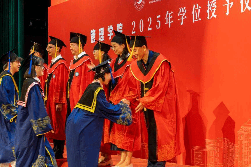 学位授予仪式上,毕业生们依次登台,学院学位评定分委员会委员为毕业生“拔穗礼”,逐一发放学位证书。