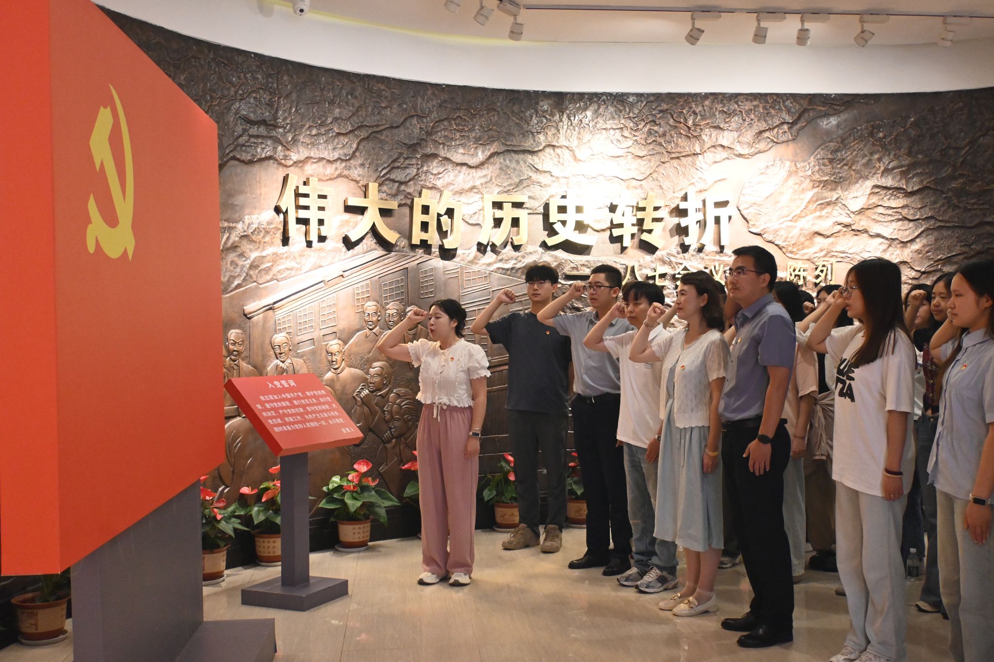 随后,全体参会人员移步纪念馆序厅,鲜红的党旗前,研究生第四党支部书记熊珍带领全体党员齐声宣读入党誓词。铿锵有力的誓言在纪念馆内回荡,彰显着党员们为共产主义事业奋斗终身的决心。在讲解员的引导下,师生们开启了一场穿越时空的红色之旅,参观学习了一楼《伟大的历史转折》基本陈列和二楼会址复原,通过生动的历史图片、泛黄的文件手稿和详实的文字记载,大家对八七会议召开的时代背景、会议过程和重大历史意义有了更深刻的了解。