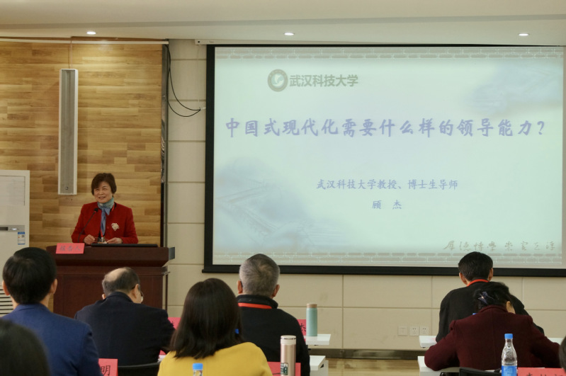 会议的主题报告阶段由湖北城市建设职业技术学院党委书记、研究会副会长程超胜主持,研究会会长、pa电子官方网站院长邓旭东教授作2022年度研究会工作报告,总结研究会在强化科学理论研究、优化组织管理建设、加强信息宣传推广、拓展对外交流与合作等方面所做的工作。研究会秘书长周勇教授作2022年度财务报告以及研究会理事增选情况报告。pa电子官方网站原正校级干部、教授、博士生导师顾杰作了题为《中国式现代化需要什么样的领导能力?》的主题报告。顾杰教授在报告中深刻阐释了中国式现代化的五个基本内涵和九个本质要求,详细说明了中国式现代化与新时代领导力的关系,并从十个方面提出如何提高推进中国式现代化急需的领导能力建设。