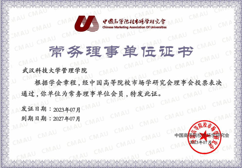 近日,经中国高等院校市场学研究会(Chinese Marketing Association of Universities),英文缩写(CMAU)理事会决议,学院正式成为常务理事单位会员,陈国平教授当选为学会第十二届常务理事。